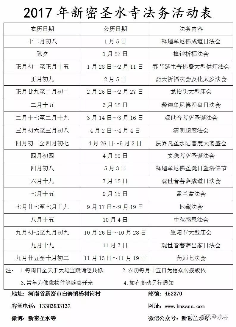 河南省新密市圣水寺继第三届圆满殊胜的水陆空大法会后,应众大德护法居士之盛请,及该寺普度众生之大乘悲心,特定于2017年农历四月初一日至四月初七日(阳历4月26日至5月2日)举行第四届众姓水陆大法会,全寺近百位法师参加诵经拜忏,施放瑜伽焰口等功德法事,如法如仪举行。仗佛菩萨之悲心愿力,使现身参与法会者身心康乐,福慧双增;延生者消灾吉祥,福寿增延;已亡者,佛慈接引,得度往生极乐莲邦;普愿共祈世界和平、国运昌隆,风调雨顺、社会和谐、众生安乐。